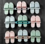 Foldable 3-in-1 wall mounted organizer rack for shoes, slippers, and towels with easy self-adhesive installation.
