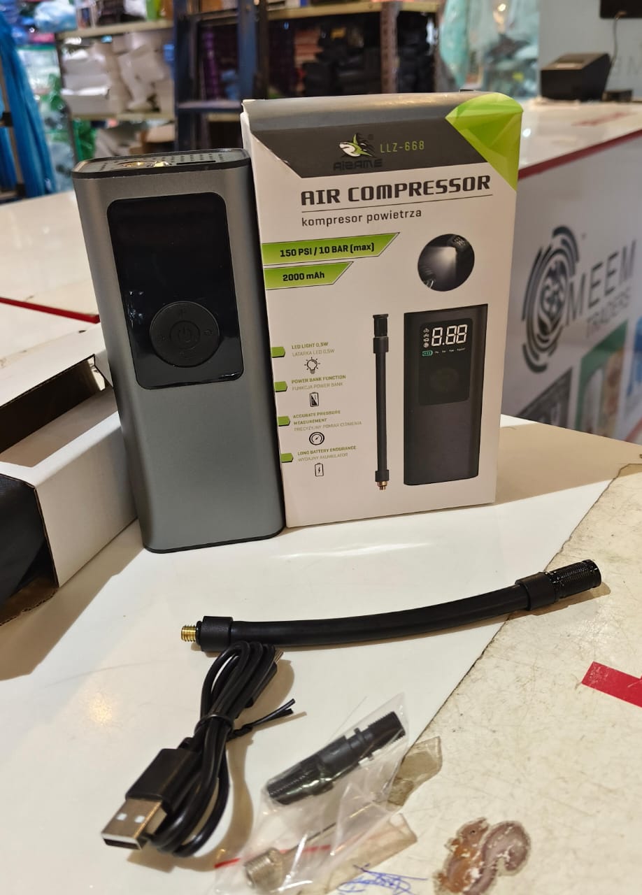 This Wireless Electric Air Compressor is a portable and powerful air pump designed for inflating car and motorcycle tires quickly and efficiently. It features a rechargeable, cordless design that makes it easy to use anytime, anywhere without needing a direct power source. The digital display allows accurate pressure monitoring, ensuring safe and precise inflation. Compact and lightweight, it is perfect for emergency use, travel, and everyday tire maintenance.